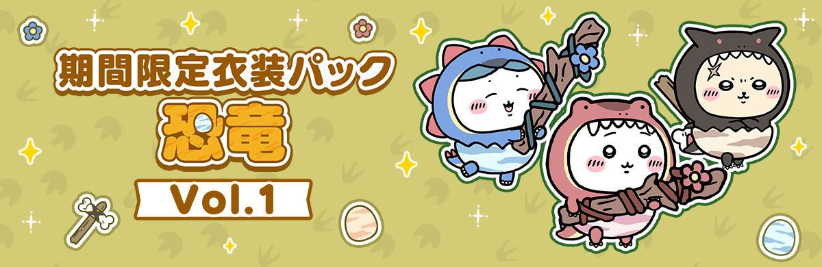 期間限定衣装「恐竜」のちいかわ、ハチワレ、ラッコがそれぞれ入った衣装パックの販売を開始いたしました。