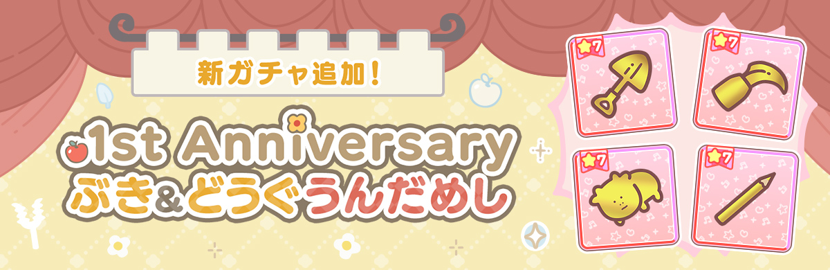 2026/4/10 15:00(UTC+9)より、新ガチャ「1st Anniversaryぶき&どうぐうんだめし」を開催いたしました。